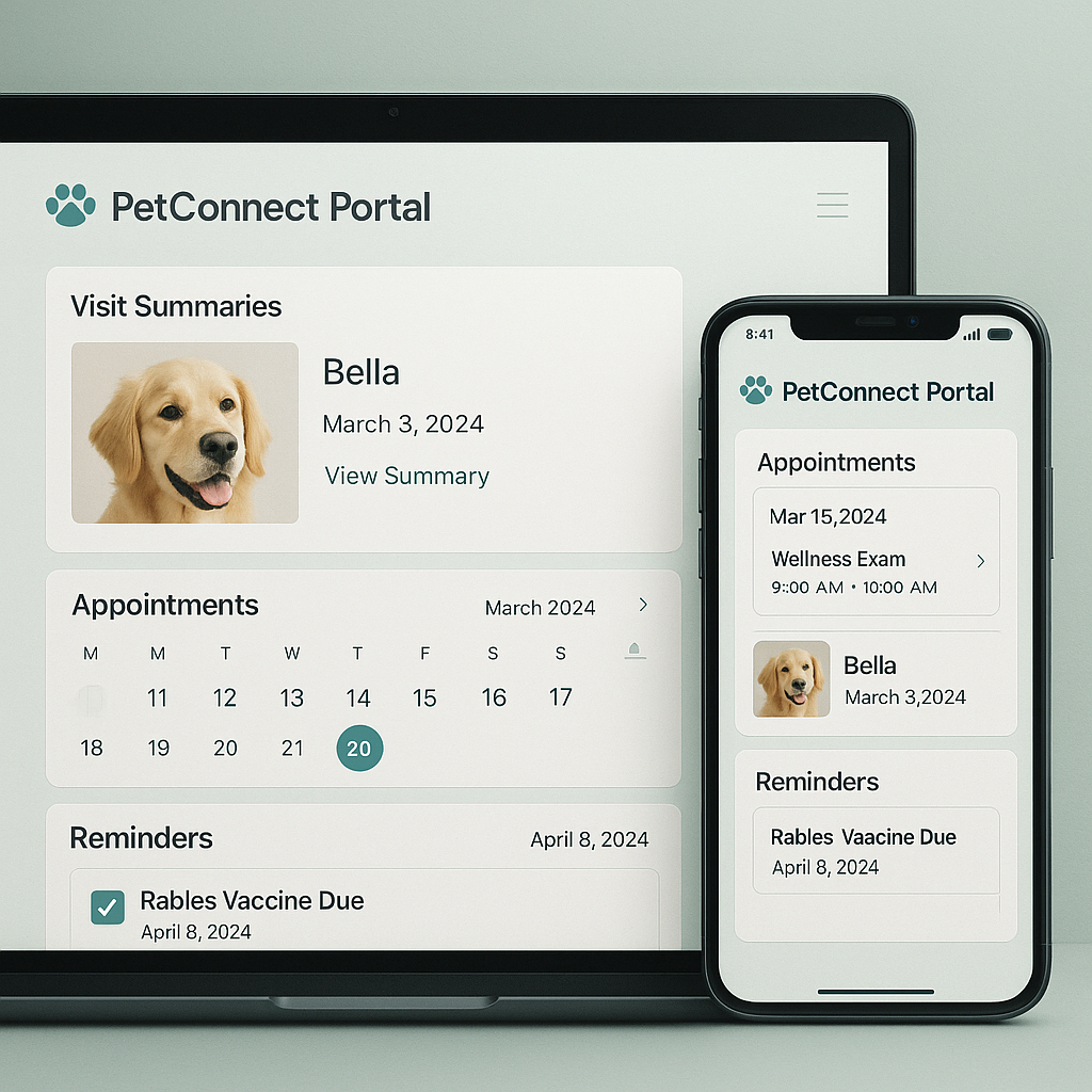 PetConnect Portal is a white-labeled communication center for pet owners. It enables appointment scheduling, vaccination and medication reminders, secure messaging, and post-visit summaries with PDFs. Owners can manage multiple pets from one interface.